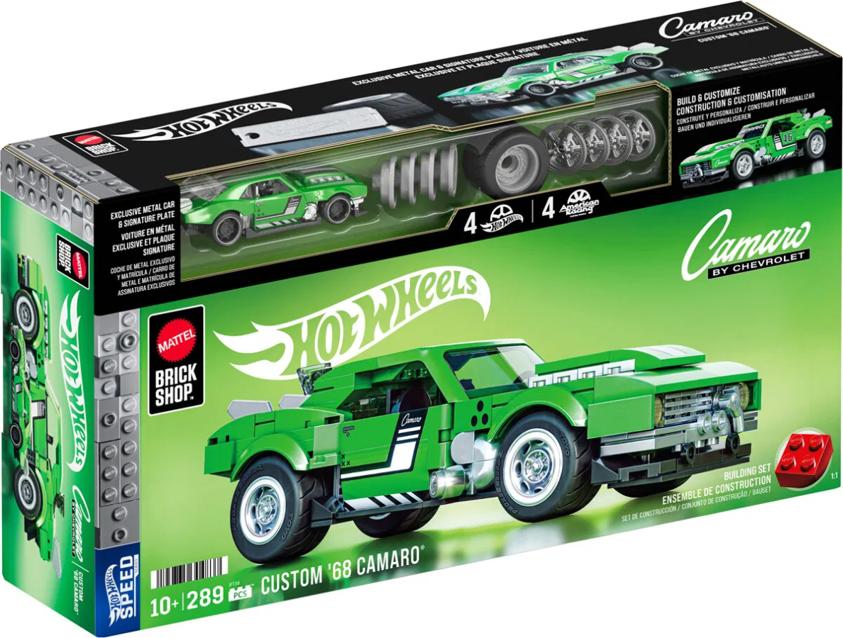 Växla upp till högsta växeln med den byggbara Custom ’68 Camaro i skala 1:32 från Mattel Brick Shop. Detta detaljerade och autentiska set innehåller dekaler för anpassning, en signaturplatta i metall samt en exklusiv matchande metallbil. Samla alla bilar i Speed-serien och bygg din samling.
